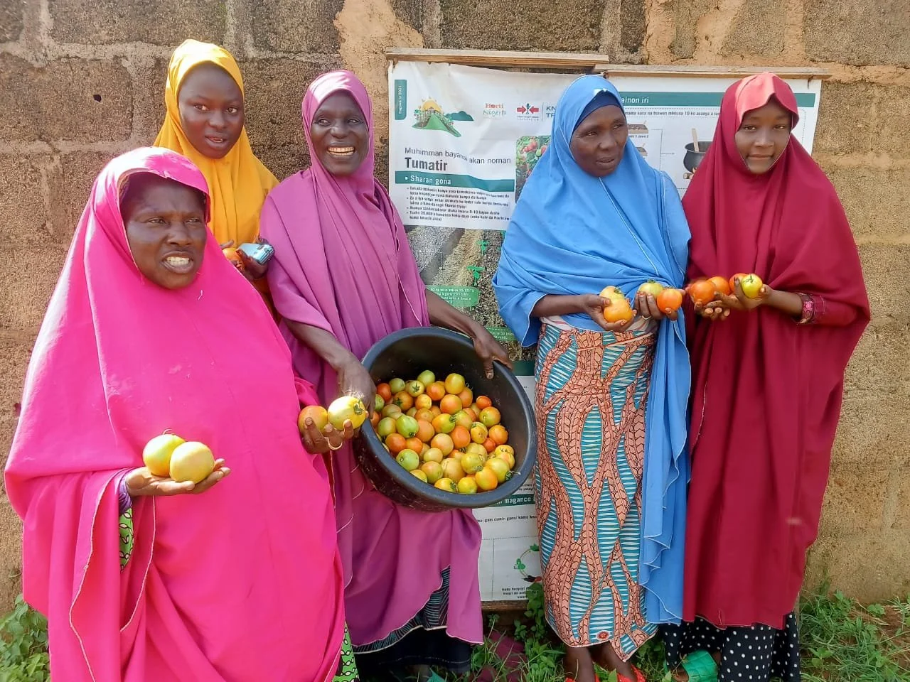 A group of women showcasing their harvested tomatoes after applying the proposed production method